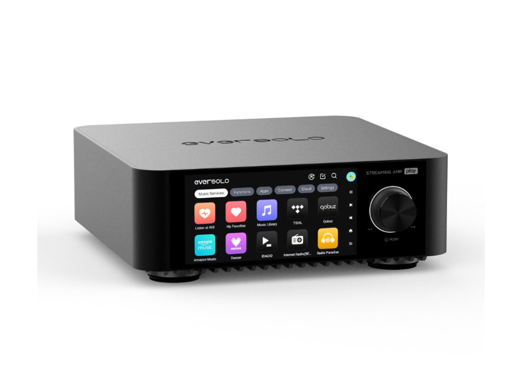 Eversolo Play je streamovací audio systém so zosilňovačom triedy D (60 W RMS pri 8Ω) a D/A prevodníkom AK4493SEQ. Umožňuje streamovanie z TIDAL, Qobuz, Spotify aj zo sieťových úložísk (NAS). Nechýba HDMI ARC, PHONO vstup ani USB Audio Out. Ponúka dotykový displej, podporu multiroom, kalibráciu zvuku aj ovládanie cez aplikáciu. Výrobca: Eversolo, Model: Eversolo Play.